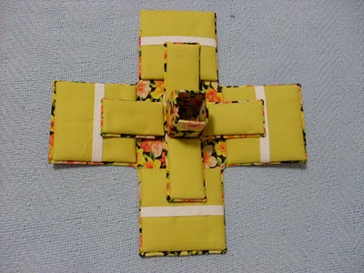 Para fazer a cruz interna, você irá cortar um quadrado de 18cmx18cm e fazer a cruz ao meio, de modo que cada lado fique com as seguintes medidas 7cm (quadrado)4cm (meio retangulo) 7cm (quadrado)
